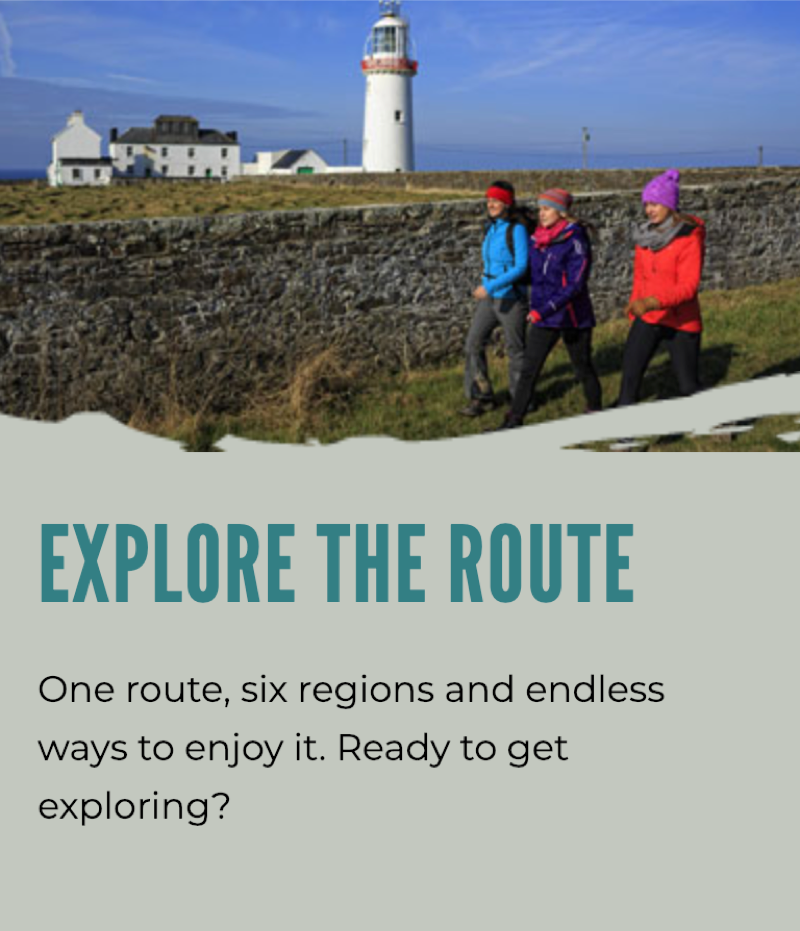 A scenic view of the coastline at sunset with a road winding along green hills, some houses, and the ocean in the background. Text overlay promotes a two-day trip along the Bay Coast to Galway and Mayo, Ireland.